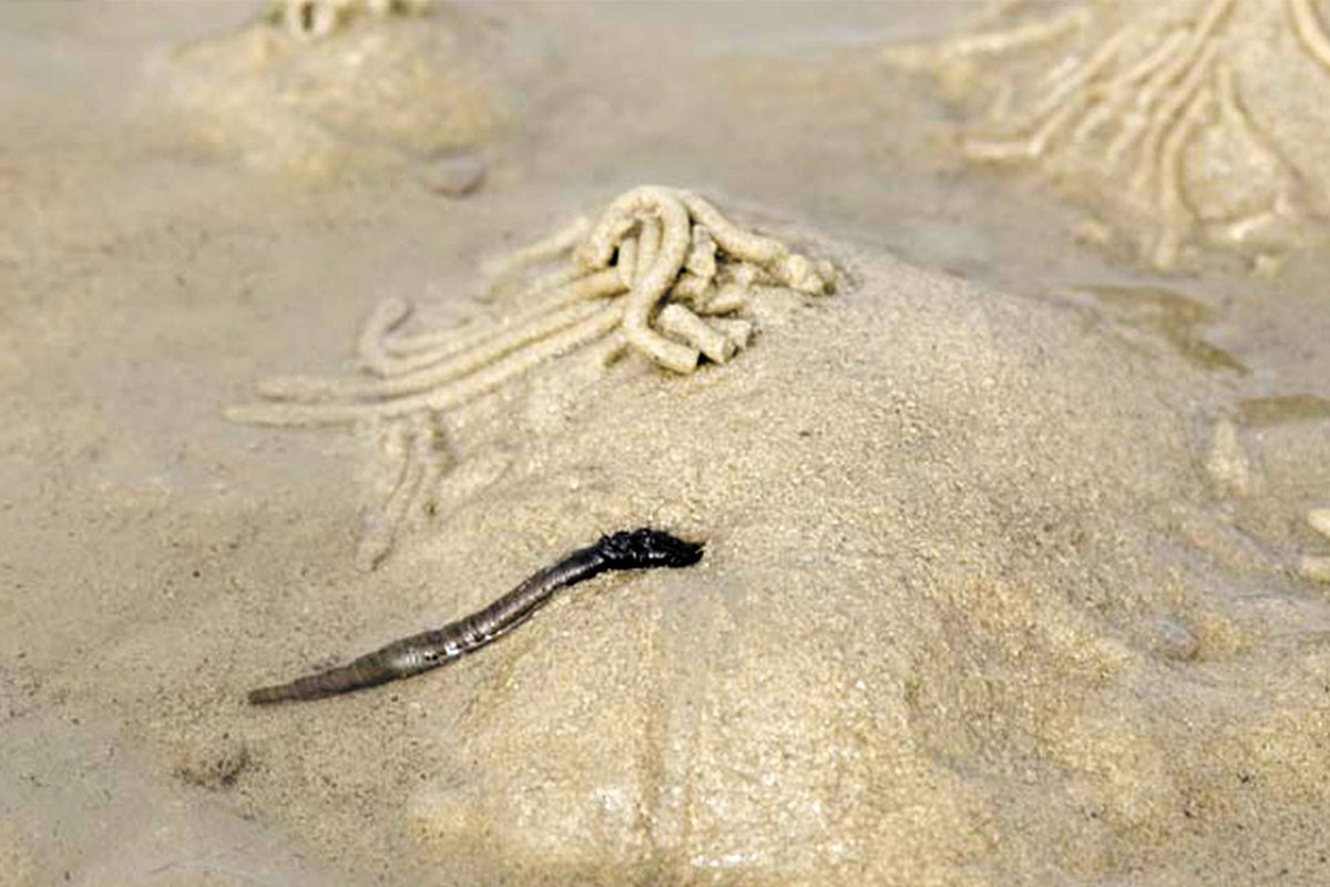 Сравним найденные ихнофоссилии со следами жизнедеятельности современного организма – морского пескожила из семейства Arenicolidae. Это крупные многощетинковые черви длиной до 20 см, обитающие в U-образных норках, которые роют в илисто-песчаном грунте. Питаются, пропуская через кишечник донный осадок. Пескожилы населяют приливно-отливную зону и верхнюю сублитораль морей Северной Атлантики и Северного Ледовитого океана, где образуют плотные поселения на обширных территориях – «пескожильные пляжи» [2] (рис. 26) и оставляют специфические ходы в иле (рис. 27).