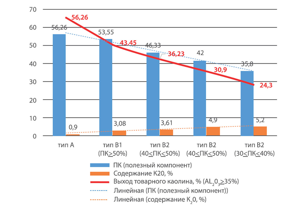 Основным компонентом, определяющим количественное содержание каолинита, является оксид алюминия. Основываясь на опыте работы многих предприятий, потребляющих каолин, можно констатировать факт, что каолиновым концентратом считается материал, выделенный при обогащении каолина-сырца с содержанием оксида алюминия в нем не менее 35% [1]. При подсчете запасов каолинов на месторождении принято считать полезным компонентом (далее ПК) в каолине-сырце фракцию менее 63 мкм [2]. При граничном зерне классификации нормальных каолинов по размеру частиц 63 мкм содержание оксида алюминия в фр-0063 составляет 36% и более (таблица 1). Содержание оксида алюминия в полезном компоненте каолинового сырья взаимосвязано с содержанием щелочных минералов, в частности, с содержанием оксида калия, зависимость выхода товарного каолина от содержания оксида алюминия и оксида калия представлена на рис. 2. При обогащении щелочных каолинов (с целью получения каолинового концентрата с содержанием Al2O3 более 35%) возникает необходимость снизить граничное зерно классификации: